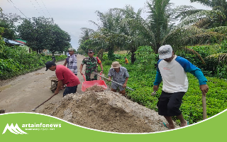 Babinsa dan Warga Sri Torop Kompak Gotong Royong Perbaiki Jalan Rusak