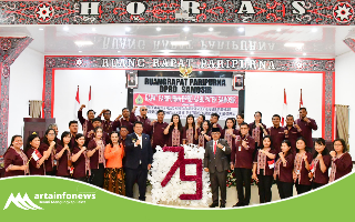 Samosir(Sumut)-artainfonews.com-Bupati Samosir Vandiko T. Gultom bersama Ketua dan Anggota DPRD Kabupaten Samosir mendengarkan pidato kenegaraan Presiden RI dalam rangka Hari Ulang Tahun (HUT) RI Ke-79 di Gedung DPRD Kabupaten Samosir, 16/08.