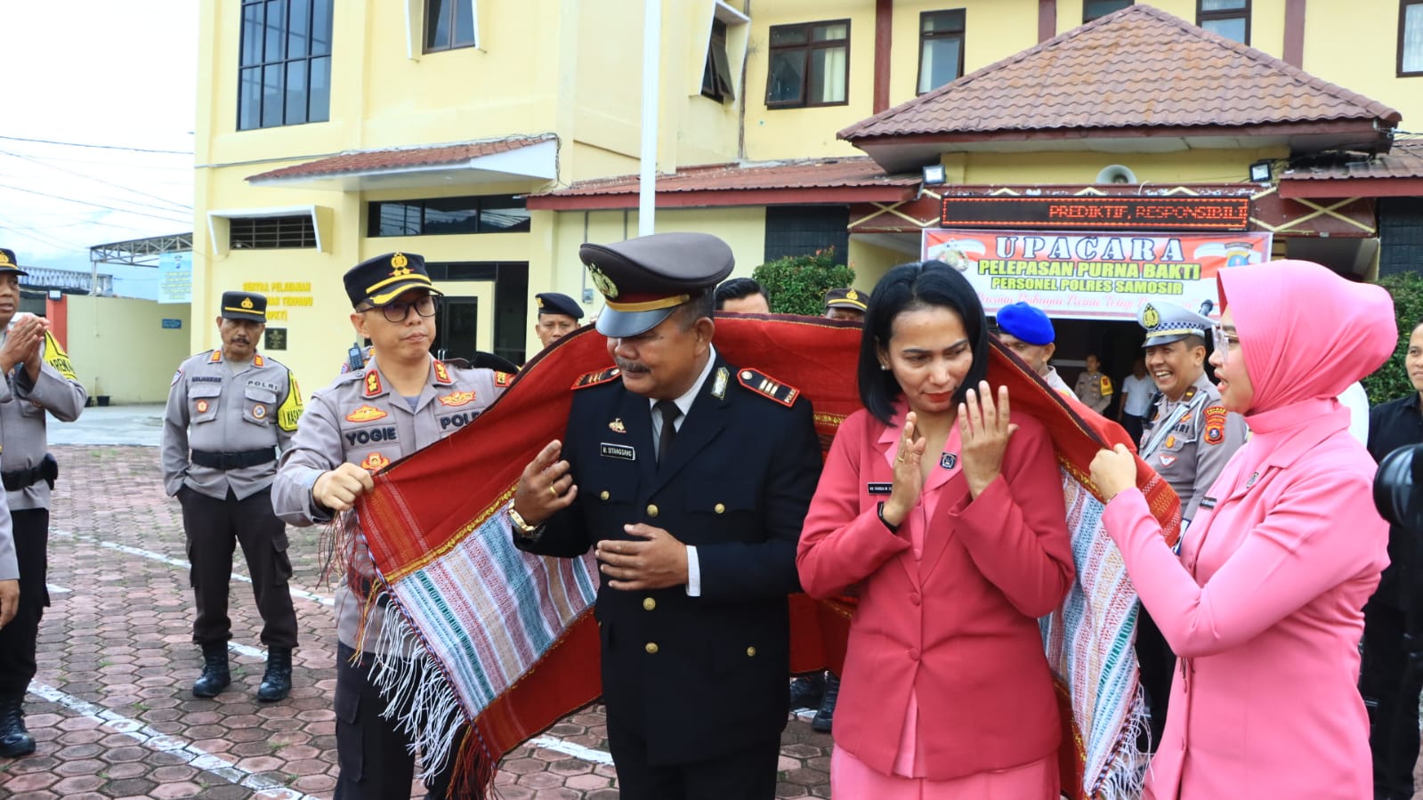 Samosir(Sumut)-artainfonews.com-Kapolres Samosir, AKBP Yogie Hardiman, S.H., S.I.K., M.H memimpin upacara pelepasan wisuda purna bhakti bagi dua perwira Polres Samosir dan satu PNS Polres Samosir di Lapangan Mako Polres Samosir, Sabtu (05/10/2024).