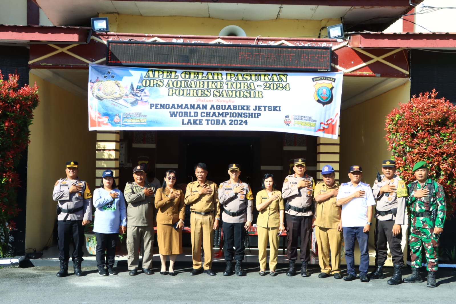 Samosir(Sumut)-artainfonews.com-Polres Samosir menggelar Apel Pasukan Operasi Aquabike Toba 2024 di Lapangan Mako Polres Samosir pagi ini. Apel dipimpin oleh Kapolres Samosir, AKBP Yogie Hardiman, S.H., S.I.K., M.H., dan bertujuan memastikan kesiapan pengamanan untuk ajang Aquabike Jetski World Championship Lake Toba 2024. Acara ini dihadiri oleh personel Polri, TNI, Pemerintah Kabupaten Samosir, dan instansi terkait. (11/11/2024)