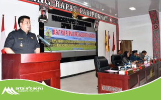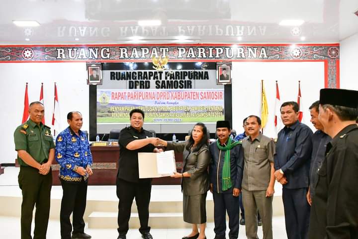 Samosir Sumut-artainfonews.com-Bupati Samosir Vandiko T Gultom menerima Rekomendasi DPRD pada rapat Paripurna penyampaian keputusan DPRD Kabupaten Samosir tentang rekomendasi DPRD Kabupaten Atas LKPj Bupati Samosir T.A 2023 di ruang Rapat Paripurna DPRD Parbaba, Senin (20/5/24).